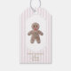 Ajoutez une touche ludique à vos cadeaux avec cette étiquette de Noël homme en pain d'épices avec un personnage de biscuit souriant avec une cravate arc. Placé sur des rayures rose pastel, ce design est parfait pour l'emballage de vacances, les faveurs d'échange de biscuits et les gâteries de Noël.