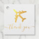 Un avion en or ou en argent REAL FOIL avec un graphique du centre du coeur sur les étiquettes de faveur du thème de voyage les plus mignonnes, parfait pour ajouter à l'hôtel des sacs de bienvenue et des cadeaux de fête nuptiale pour remercier la famille et les amis de voyager à votre destination ou mariage de plage ou d'assister à une douche ou un anniversaire thème de voyage. Front a une icône de plan moderne et merci texte dans une couleur de feuille, tandis que le dos est entièrement personnalisable avec les polices et les couleurs de votre choix. La papeterie entièrement coordonnée est disponible dans la Boutique de dessinateurs de papier sur mesure Zazzle Works.