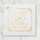 Ces étiquettes en or (ou en argent) font office de monogramme personnalisé des noms de mariée et de mariée et de date mariage encadrés par un élégant cadre de défilement carré sur le devant. L'espace pour une photo en couleur complète est inclus au dos - parfait pour afficher une photo fiançailles préférée du couple.