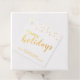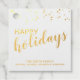 Elégant Gold Foil Holiday Gift Tag avec le titre en feuille d'or véritable 'Happy Holidays' dans le style de police de script moderne avec nom de famille dans le style de police sans serif moderne et confetti sur arrière - plan blanc.