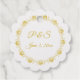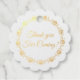Ce design élégant présente une bordure en feuille d'or fantaisie faite de ventilateurs et de fioritures et les mots : Merci pour venir! Sur le dos se trouvent les initiales du monogramme des jeunes mariés et la date du mariage et la bordure répétée dans un or correspondant.