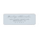 Ces étiquettes d'adresse de retour présentent un design simple et élégant avec un fond bleu clair et un texte gris foncé. La mise en page comprend une écriture cursive pour les noms en haut, suivie d'une police sérif pour les adresses, créant un contraste sophistiqué. La composition minimaliste met l'accent sur la clarté et la concentration, ce qui la rend parfaite pour une correspondance personnalisée. La palette de couleurs sereine et la typographie raffinée transmettent un sentiment de tranquillité et de formalité, idéal pour les occasions spéciales ou une utilisation quotidienne.