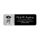 Élégant modèle d'étiquette d'adresse de retour de diplômé présentant une calotte de graduation avec initiale et année sur fond de faux strass de ton argent imprimé à gauche et nom de couleur gris argent clair et adresse de retour sur fond noir à droite. Parfait pour vos envois de célébration. Conception de Holiday Hearts Designs (droits réservés).