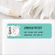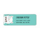 Étiquette de adresse turquoise avec un chaton blanc avec une cravate arc-en-ciel et un monocle.