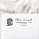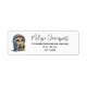 Étiquettes de adresse avec un kawaii illustration d'un hibou aux yeux grands dans une robe d'hiver et foulard tenant un café chaud.