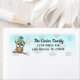 Joli hibou festif peint à la main assis sur une branche, avec des flocons de neige bleus recouverts d'étiquettes d'adresse de retour de Noël arrière - plan.