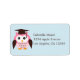 Un mignon étiquette de adresse de remise de diplômes pour enfants met en vedette un hibou rose portant une casquette de remise de diplômes contre un arrière - plan bleu. La couleur peut être modifiée à l'aide de l'outil de customise. Graphiques ©Babystar Design.
