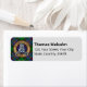 Clan Malcolm or MacCallum crest badge surrounded by a strap and buckle over tartan background. Custom text fields for name and address.