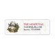 Ces étiquettes d'adresse de retour de vacances ont l'image d'un adorable chiot Collie barbu assis dans un panier en osier. Le panier est orné de feuilles verts et de baies rouges. Votre texte personnalisé est en rouge et noir à droite. Un subtil arrière - plan de confettis en or donne un intérêt supplémentaire.