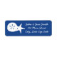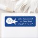 Une étiquette d'adresse de retour bleue est décorée d'un dollar de sable blanc et d'étoiles de mer sur la gauche et d'un exemple de texte sur la droite pour customiser de le faire vous-même. Utilisez ces étiquettes à l'extérieur de vos invitations ou cartes "Merci" pour une touche élégante, surtout lorsqu'ils sont combinés avec les autres coquillages d'été dans les cartes bleues, ou échangez avec les étiquettes d'adresse standard pour pré-adresser les cartes RSVP pour vos invités.