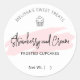 Boulangerie Falvor Nom Étiquette dans un design féminin avec police de caractères de script moderne et d'aquarelle rose arrière - plan et icône de cupcake. Utilisez cet élégant autocollant rond pour créer des autocollants personnalisés pour vos cupcakes ou desserts.
