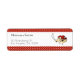 Adorable étiquette d'adresse de retour en rouge avec pois avec l'illustration d'un oiseau pirate avec son timbre, son bandana et son épée. Modifiez le texte pour vous-même. Illustré et dessiné par Patricia Alvarez.