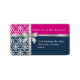 © 2021 Socialite Designs. Élégante étiquette d'adresse de retour de mariage modèle pour un mariage d'été incorporant un damas blanc, un ruban et un arc en croix d'argent imprimé, et deux couleurs arrière - plans de fuchsia et bleu marine. Veuillez contacter Socialite Designs si vous souhaitez une combinaison de couleurs différente, aider à customiser, ou d'autres produits mariages créés avec ce design. VEUILLEZ NOTER QUE LE RIBBON EST UN DESIGN QUI EST IMPRIMÉ.