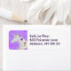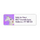 Étiquette d'adresse de retour avec une licorne blanche sur un arrière - plan violet.