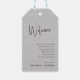 Étiquette de cadeau de mariage de bienvenue, minimaliste fantaisiste moderne, typographie de script blanc personnalisable. Le fond de texture imprimée en lin gris clair ajoute une touche de sensation organique et d'élégance classique. D'autres couleurs sont disponibles.