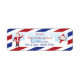 Christmas Père Noël Air Mail Return Address Label est un produit de vacances. Il a des bordures de rayures bleues foncées et rouges comme certaines enveloppes de courrier aérien l'ont fait. Le Père Noël est à gauche, debout sur la neige, agitant un sucre de canne et à droite, il y a un Snowman coupé. Le texte est personnalisable pour que vous puissiez choisir une autre police, une autre couleur et la taille de la lettre.