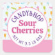 Un étiquette d'emballage amusant ou autocollant dans un motif de bonbons qui comprend des popsicles colorés, des glaces, des sucettes et des bonbons en vert, orange, bleu et rose. Idéal pour les fêtes avec des bonbons ou des confiseries qui ont besoin de étiquettes pour leurs sacs à bonbons, avec la saveur de bonbons "Sour Cherries" modifiable avec votre propre produit. En utilisant l'éditeur Zazzle, vous pouvez changer la bande de design rose en bas pour la rendre dans la couleur que vous voulez, ce qui est idéal pour plusieurs utilisations de marque.