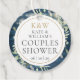 Caractérisée par de jolies guirlandes lumineuses et de délicates feuilles de verdure aquarellées sur un fond en bois bleu rustique, cette élégante étiquette de cadeau pour la fête de couple peut être personnalisée avec vos initiales de monogramme dorées et les informations relatives à la fête de mariage. Conçue par Thisisnotme©