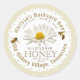 Saint-Jacques blanc sur étiquette miel d'ivoire pâle avec marguerite réaliste et abeilles de miel. "HONEY" imprimé dans une police de style vintage et le nom et l'emplacement de l'Apiary sont imprimés dans une police de gabarit à l'ancienne.