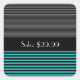 Une étiquette de prix de vente préppy avec des rayures turquoises et noires fraîches sur le fond et un motif rayé noir et gris tendance sur le reste de l'autocollant.