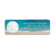 Étiquettes d'adresse de retour d'eau tropicale. L'eau de l'océan turquoise sombre vient lécher le rivage avec une grande image de dollar de sable blanc. Texte imprimé blanc pour les noms et l'adresse, sur des étiquettes fines.