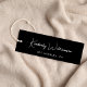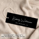 Vêtements, accessoires, bijoux, boutique, etc., élégants et chics, marque de étiquette noir avec une ambiance minimaliste avec votre nom ou marque dans un script design de signature blanche. Ajoutez du texte supplémentaire ci-dessous et sur le dos dans une simple typographie blanche moderne.