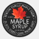 Modifiez votre nom d'entreprise, votre adresse, le volume de sirop d'érable et votre grade. Feuille d'érable à sucre rouge réaliste avec détails morphologiques sur arrière - plan noir. Texte du tableau de bord blanc. Simple ligne blanche le long de la bordure de étiquette. T-shirts correspondants disponibles ici : https://www.zazzle.com/z/azuo1u2f?rf=238554714266425419
