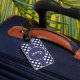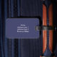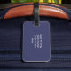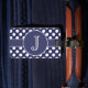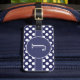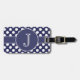 Motif à pois de bleu marine et blanc avec une rayure assortie et médaillon rond pour que vous personnalisiez avec votre initiale décorée d'un monogramme. Ajoutez votre texte de l'information ou de coutume sur le dos de l'étiquette de bagage.