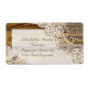 Elégante dentelle blanche rustique sur étiquette mariage en bois avec dentelle blanche sur bois brun qui couvre deux coins d'un rectangle blanc avec bordure en bois brun. Texte en marron. Notez que la dentelle et le bois sont tous "imprimés" et non des matériaux réels. Ce design élégant, chic et romantique, à l'essence rustique, fait partie d'un ensemble mariage et est parfait pour un mariage rustique chic ou occidental de printemps, d'été, d'automne ou d'automne. Il fonctionnera également parfaitement pour un mariage à thème grange occidentale.