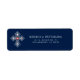 Image d'une croix de diamant blanc avec un accent de pierre rouge sur un arrière - plan bleu foncé. Texte personnalisé en blanc.