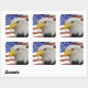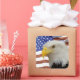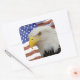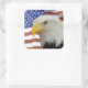 Image de la tête d'un aigle chauve au-dessus d'un drapeau américain agitant dans une brise.