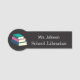 Une étiquette noire pour les bibliothécaires de l'école avec une pile de 3 livres colorés sur un faux arrière - plan de tableau de bord.Personnalisé avec un nom et un titre d'emploi. © ArianeC Illustrations-Tous droits réservés