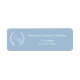 A dusty blue colored background. Decorated with a white wreath. Personalize and add your names, address and your first name initials. White text.