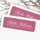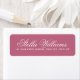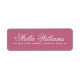 Étiquettes d'adresse de retour élégantes avec votre nom dans une police de calligraphie élégante et l'adresse ci-dessous sur un fond rose mauve.