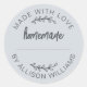 Autocollant pastel bleu Fabriqué Avec Amour avec une typographie légèrement noire et un design d'écriture manuscrit. Parfait pour sceller les pâtisseries, les pots de confiture, les biscuits, le pain, les boîtes à tarte, l'emballage des petites entreprises, les faveurs de fête et les cadeaux faits à la main. Comprend une ligne de nom personnalisable, ce qui la rend idéale pour les boulangers amateurs, les artisans et les petites marques à la recherche d'une finition douce et propre. Personnalisez facilement avec votre nom ou les détails de votre boutique.