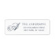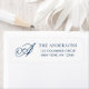 Une élégante étiquette minimaliste d'adresse de retour avec votre monogramme initial en typographie de script. Personnalisez avec votre nom et votre adresse dans une simple typographie bleu foncé.