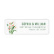 Ces étiquettes d'adresse de retour présentent un design épuré et minimaliste avec une illustration élégante de callas sur le côté gauche. La palette de couleurs comprend du blanc, du vert foncé et des touches d'orange-jaune provenant des centres des fleurs, créant un équilibre harmonieux entre sophistication et simplicité. La typographie est audacieuse et classique, renforçant l'esthétique formelle adaptée aux occasions spéciales. Avec un espace négatif généreux, ces étiquettes transmettent une ambiance raffinée, parfaite pour ajouter une touche d'élégance discrète à votre correspondance.