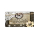 Modèles d'étiquettes d'adresse de remerciement de mariage de style rustique - Couple vieux fer à cheval cœur avec nœud de corde et dentelle blanche, tournesol, guirlandes lumineuses et tissu de toile de jute sur fond de bois de grange ancien.