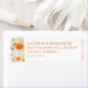 Cette étiquette d'adresse de retour présente un design romantique et d'inspiration vintage avec un motif floral pastel doux sur la gauche, mettant en valeur des teintes orange, jaune, verte et beige dans un style aquarelle. Le côté droit présente une typographie élégante sérif rouge corail qui est personnalisable pour les noms, adresses, lieux et dates, offrant une touche personnelle à votre correspondance. La composition équilibrée combine des florales délicates avec un texte clair, créant une atmosphère de chaleur et de nostalgie, parfaite pour ajouter du charme aux invitations de mariage ou aux envois pour des occasions spéciales.