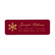 Une étiquette d'adresse de retour bordeaux et or élégante, recommandée pour la carte de vœux des fêtes d'hiver. Elle comporte un flocon de neige en feuille de faux or à gauche et un texte doré à droite. Le nom est écrit dans une calligraphie élégante, l'adresse en petites capitales. Elle peut être utilisée pour une carte de Noël ou de Nouvel An. Le fond est bordeaux (rouge profond).