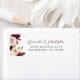 La bordure gauche de ce label d'adresse de retour mariage moderne romantique est ornée d'un bouquet floral aquarelle dans les tons bordeaux et crème. Le texte personnalisable combine un élégant script d'écriture moderne bordeaux et une police sans serif gris fusain sur un arrière - plan blanc. Idéal pour un mariage d'automne ou d'hiver.