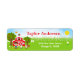Cette étiquette d'adresse mignonne et amusante présente un garçon aux cheveux bruns et à la peau claire à côté d'une grange rouge avec une girouette en forme de coq. Il y a des animaux de ferme adorables tels qu'une vache, un cochon et une poule. En arrière-plan, on voit un ciel bleu vif, des pommiers, du soleil, des papillons et des marguerites. Le texte combine des polices grasses et sans empattement pour un look élégant et moderne. C'est parfait pour une fête d'anniversaire sur le thème de la ferme.