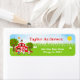 Cette étiquette d'adresse mignonne et amusante présente un garçon aux cheveux bruns et à la peau claire à côté d'une grange rouge avec une girouette en forme de coq. Il y a des animaux de ferme adorables tels qu'une vache, un cochon et une poule. En arrière-plan, on voit un ciel bleu vif, des pommiers, du soleil, des papillons et des marguerites. Le texte combine des polices grasses et sans serif pour un look stylé et moderne. C'est parfait pour une fête d'anniversaire sur le thème de la ferme.