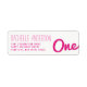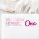 Autocollant d'étiquette d'adresse de retour pour fête d'anniversaire (1er anniversaire) de bébé fille, écriture calligraphique « One » en grand motif esquissé gras rose fuchsia vif.
