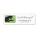 Étiquettes de adresse avec une belle photo montrant un beau cheval de baie brun allongé dans l'herbe, à l'air paisible et content.
