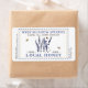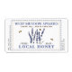 White label with a blue dotted border and vintage lavender illustration with bees. Blue Text