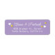 Votre adresse personnelle personnalisée d'une manière simple... étiquette couleur violet clair avec deux lignes de texte alignées par le centre, et les noms de mariée et de mariée écrits dans un style de police script élégant avec l'image de petits coeurs d'amour blanc et or.
