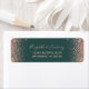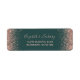 Les bords de cette élégante étiquette d'adresse de retour mariage moderne présentent une conception rose en faux parties scintillant or. Le texte personnalisable combine écriture rose rose pâle et polices de cuivre sur un arrière - plan vert foncé.