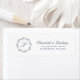 Le côté gauche de cette étiquette d'adresse de retour de faire-part de mariage comporte un monogramme initial en bleu indigo entouré d'une couronne de feuillage d'art linéaire. Ajoutez vos noms dans indigo blue classique script et l'adresse ci-dessous.