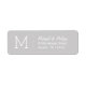 Étiquettes d'adresse de retour personnalisées avec une typographie simple et élégante sur un arrière - plan de couleur solide. Personnalisez-le avec votre initiale monogramme, nom et adresse ou tout autre texte personnalisé. Cliquez sur Customiser pour modifier les polices de texte et les couleurs, redimensionner ou déplacer du texte pour créer un design étiquette unique. Parfait pour envoyer des invitations de mariage ou tout autre papier à lettres personnalisé!